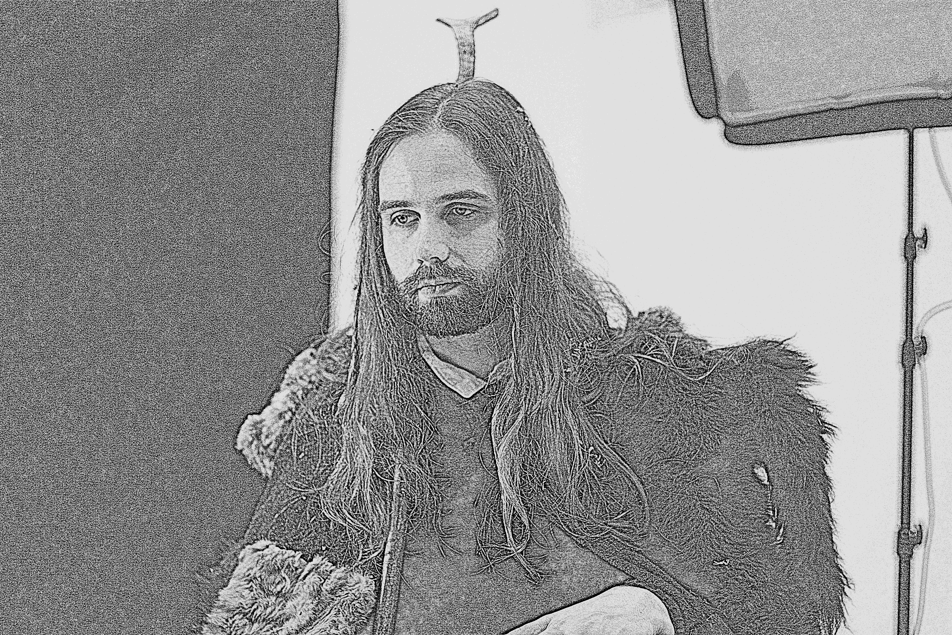 For Edvard Vermogen, I had brought along a selection of wool and fur clothing – including a heavy wool cloak covered in a patchwork of fur**. I also brought along a selection of props that a magician or scholar might happen to have on his travels such as a staff topped with an antler, a small chest and a selection of bottles and stones. Andy then posed with these while there was another series of lighting changes and more critical appraisal of the results. Tricks used this time included hiding a wireless remote flash filtered with a coloured gel (first purple, then green) inside the box so that it appeared as if a magical light was coming from it. Andy’s main hazard here was looking down at the wrong time and getting an eyeful of flash. There was also an issue of his hair being too clean and brushed. This was resolved with some backcombing and a handful of leaves and twigs.