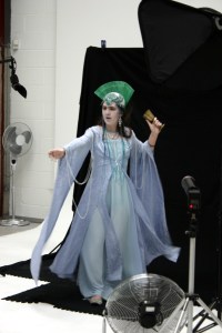 We decided to start with the Empress so Jess got dressed into her kimono* and made herself up to look undead. There was then several hours of test shots – trying to get the exact lighting effects that were desired. As this was largely an experimental shoot, there were no standard lighting set up guidelines for this so there was a lot of trial and error. Once the correct conditions were achieved there was even more work to try to get the right poses and facial expressions to ‘tell the story’ of the character. Fans were used to make the kimono flutter and many attempts (some more successful than others) were made to try to time Jess making a movement to coincide with the shutter on the camera being activated. Each shot was transmitted to two laptops (one connected directly by a wire, the other using a wireless internet card in a slot on the camera) and critically appraised by all involved before the next shot was set up. To my limited technical experience, almost every shot looked fantastic (yeah, ok, quite a few were amusing due to mistimed movement or inappropriate facial expressions) but to the experienced professionals there were minor flaws with almost all of them which needed to be corrected with either another adjustment of the lights or a new set of instructions to the model. By the end of it, Jess had sore muscles from holding poses and was a little chilly from standing in front of a fan in a flimsy kimono.