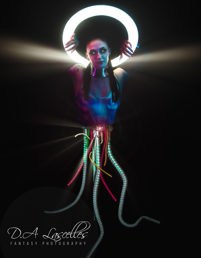 Here we have wires, LEDs and a metal shower hose pressed into service as cybernetic tentacles with some other light effects used to add drama. Transhumanism is the philosophy of merging humanity with machines in different ways and underlies some of the ideas of the Cyberpunk genre.